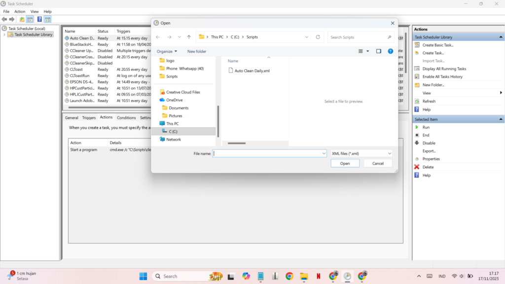 Jika kamu tidak ingin membuat Task satu per satu secara manual, Windows menyediakan fitur Import Task. Dengan fitur ini kamu cukup menggunakan file .XML yang sudah berisi semua pengaturan (General, Triggers, Actions, Conditions, Settings).